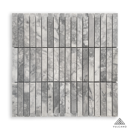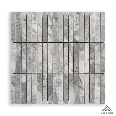 Stone Stax Superwhite is a stacked stone-look mosaic tile featuring crisp super white and light neutral tones in a layered linear format designed to create depth, texture, and dimensional surface detail.