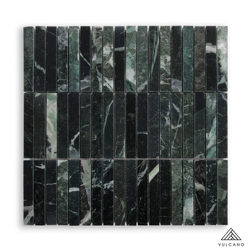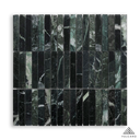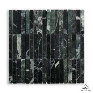 Stone Stax Tempesta Verdi is a stacked stone-look mosaic tile featuring rich green and natural stone tones in a layered linear format designed to create depth, texture, and dimensional surface detail.
