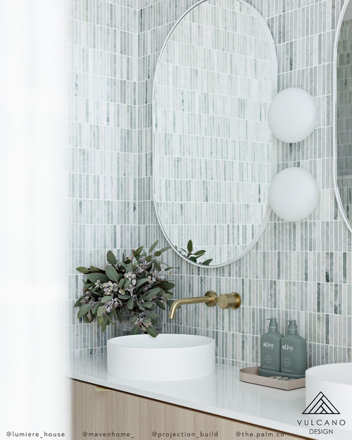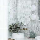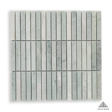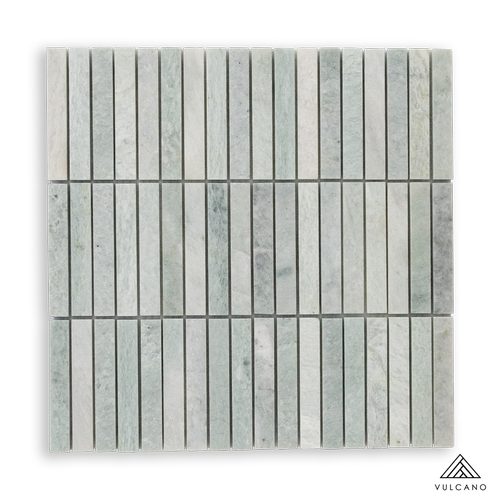 Cool white stone veined with delicate green hues, cut into sleek linear strips for a crisp stack bond layout. The honed surface softens the natural movement of the marble, making it ideal for bathrooms, splashbacks, or feature walls that call for fresh, contemporary elegance.