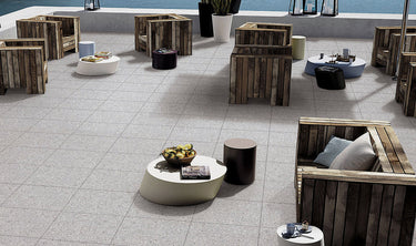 Terrazzo Stone Grigio is a porcelain tile featuring refined mid-grey tones with bold stone-inspired aggregates, designed to bring texture, depth, and a contemporary architectural character to interior spaces.