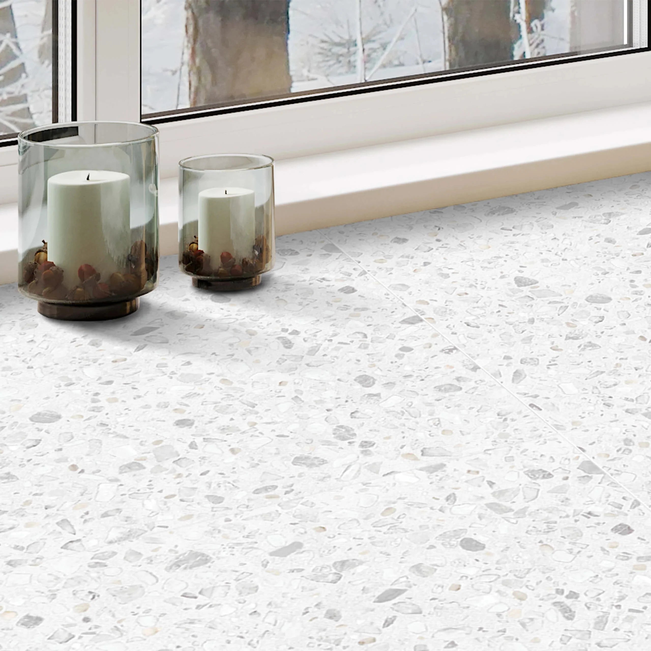 Its surface reinterprets traditional terrazzo with a calm, contemporary aesthetic, combining subtle speckling and tonal variation that adds depth while maintaining a clean and balanced finish. The light, neutral palette ensures strong versatility, making it well suited to both floor and wall applications across bathrooms, kitchens, living areas, and commercial interiors where a sophisticated yet understated surface is desired.