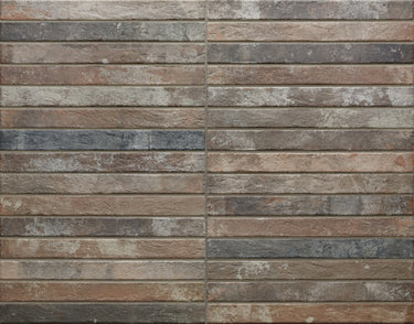 An aged brick look with layered tones of grey, rust, and earthy browns brings urban character and raw texture. Perfect for industrial-style walls or bold feature areas.
