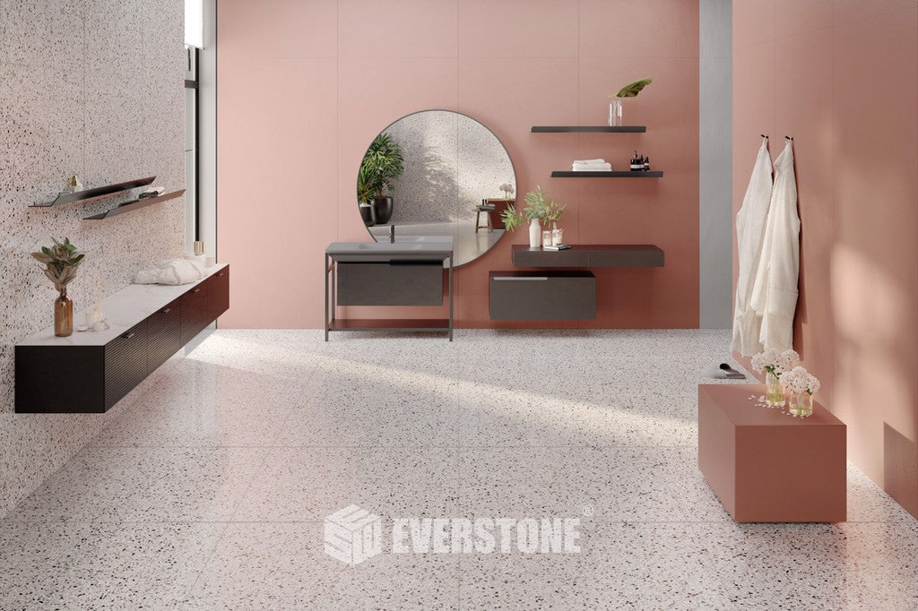 Its surface reinterprets classic terrazzo with a clean, modern aesthetic, combining subtle stone fragments and tonal variation that add depth and visual interest while maintaining a cohesive and understated finish. The bright white foundation enhances light and openness, making it well suited to both floor and wall applications across bathrooms, kitchens, living areas, and commercial interiors where a fresh and design-led surface is desired.
