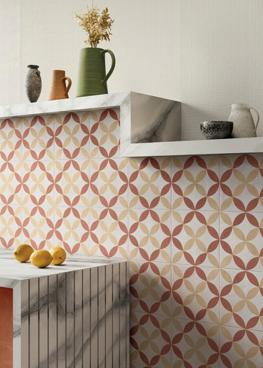 Terra Art Astro Terracotta is a decorative porcelain tile featuring a geometric patterned design in warm terracotta tones with subtle variation, designed to introduce colour, rhythm, and a grounded architectural texture to interior spaces.