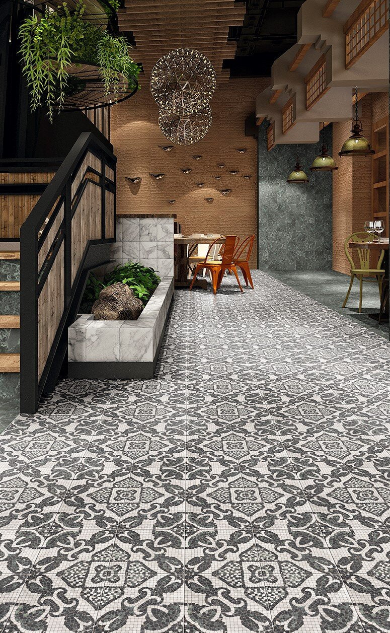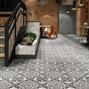 Its structured motif draws inspiration from traditional European encaustic designs, creating a repeatable layout that brings order and visual movement to a space. The monochrome palette offers a strong yet versatile foundation, allowing it to function as both a feature element and a cohesive flooring solution across entryways, bathrooms, kitchens, and commercial environments.
